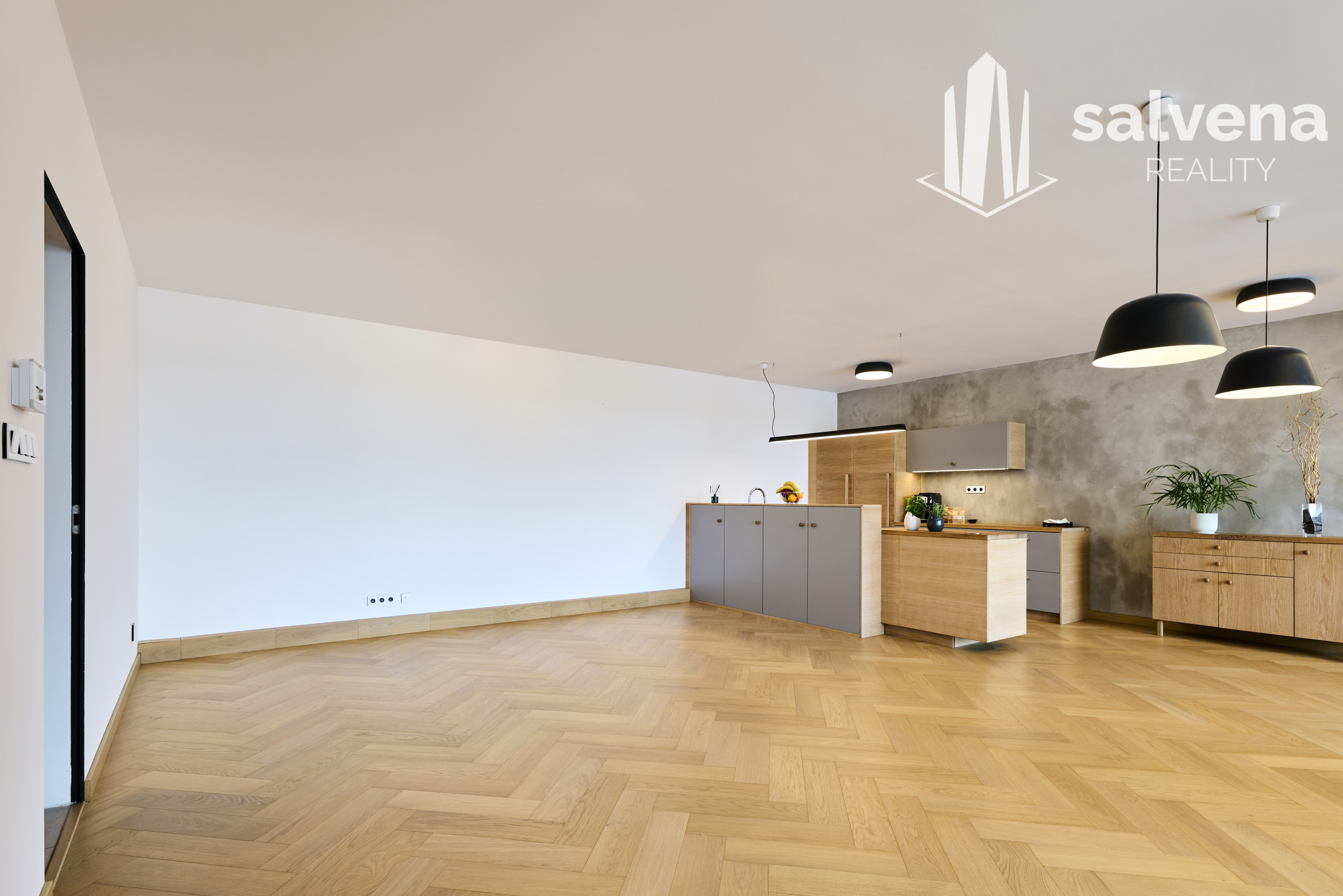Obývacia miestnosť spojená s kuchyňou a ostrovom na mieru je srdce bytu. Dubová „rybia kosť“ dodá autoritu. Obrovské posuvné presklenie stiahnete jednou rukou, vyjdete na krytú terasu a mesto je vaše – za dažďa, za slnka, o piatej ráno aj po polnoci.