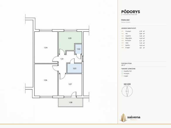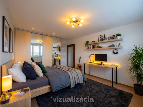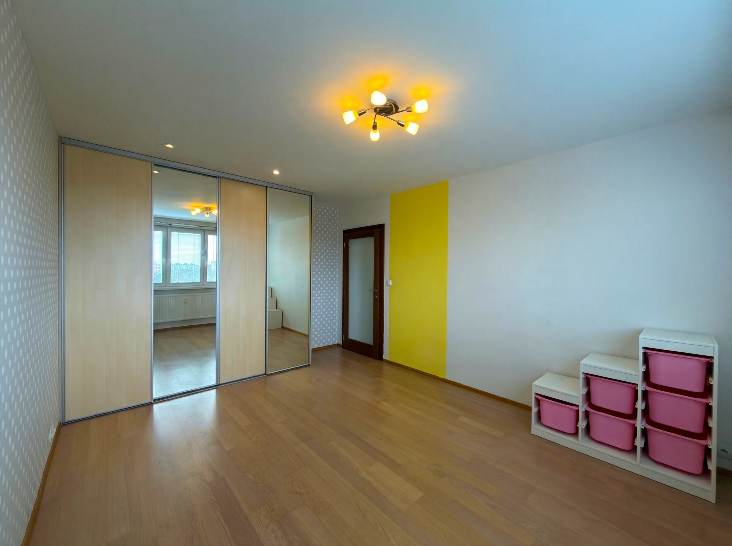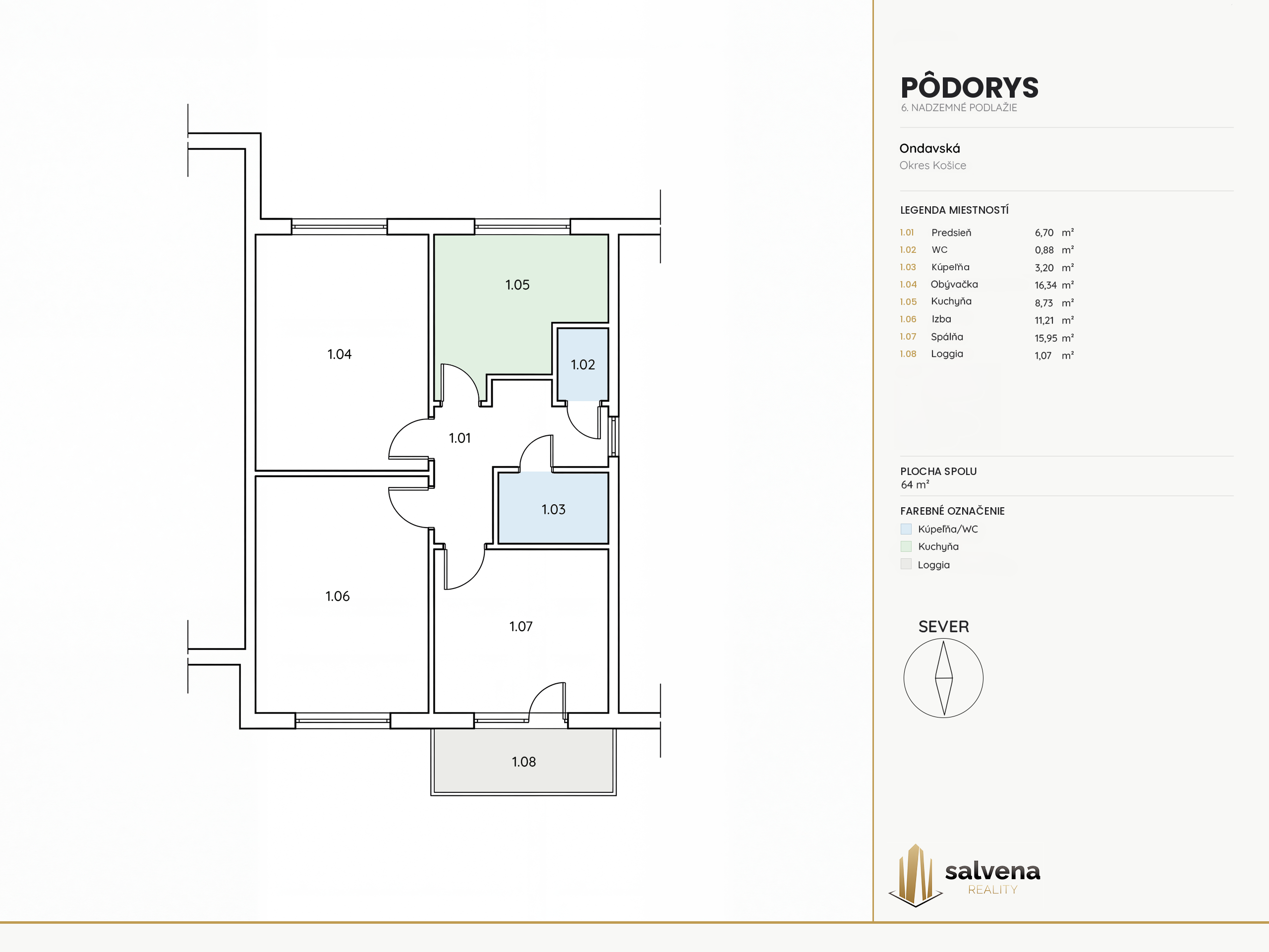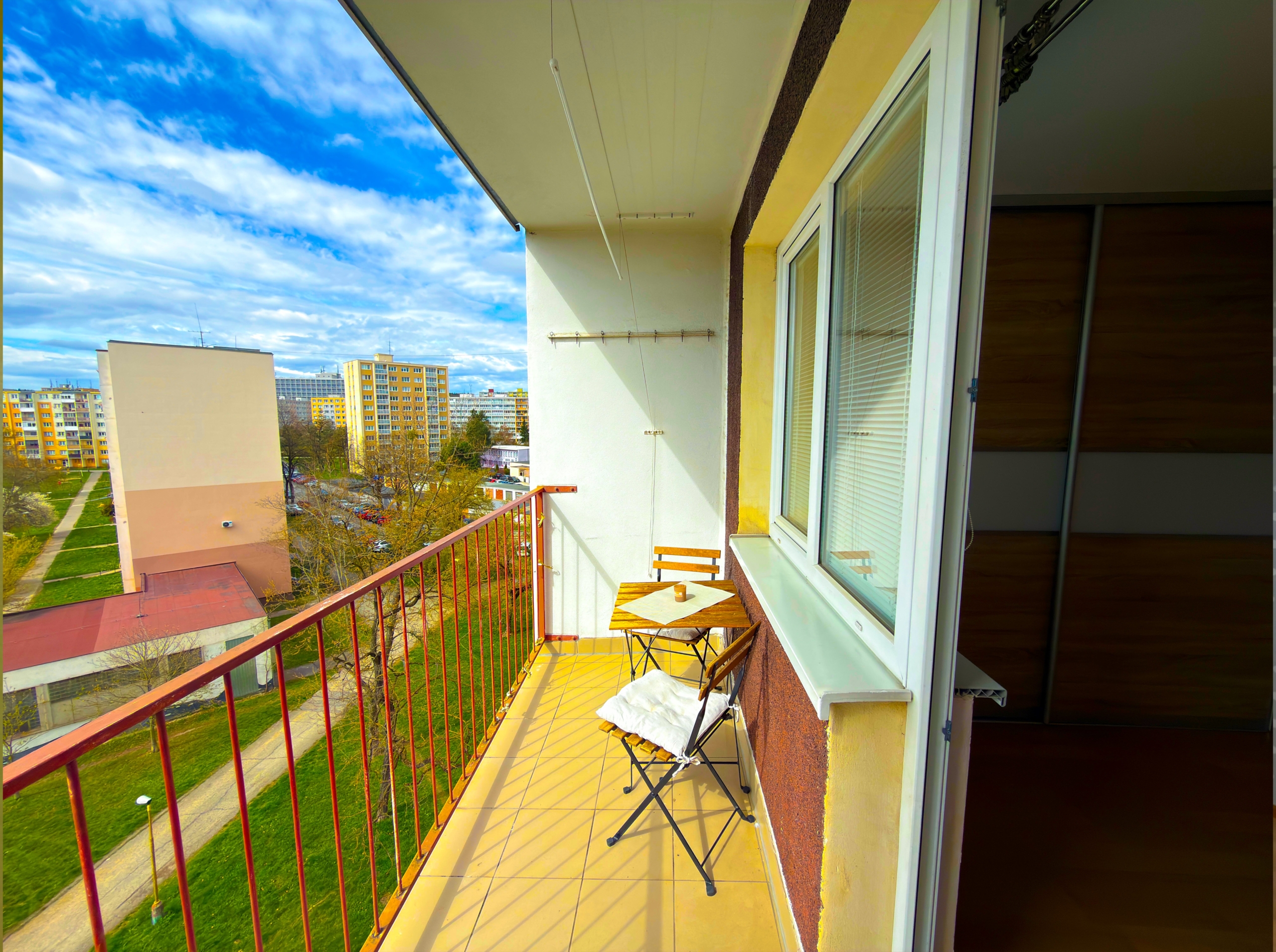Nachádza sa na 6. nadzemnom podlaží zo 7 a disponuje slnečnou loggiou. Dispozícia pozostáva z priestrannej obývačky, samostatnej spálne, izby vhodnej ako detská izba alebo pracovňa, kuchyne, kúpeľne, samostatného WC a predsiene. Veľkým plusom sú 3 nepriechodné izby – vhodné pre rodinu aj ako investícia na prenájom.
